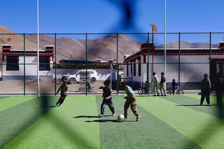 这是孩子们在长所乡森嘎村的足球场上踢球。新华每日电讯记者 周昱龙 摄