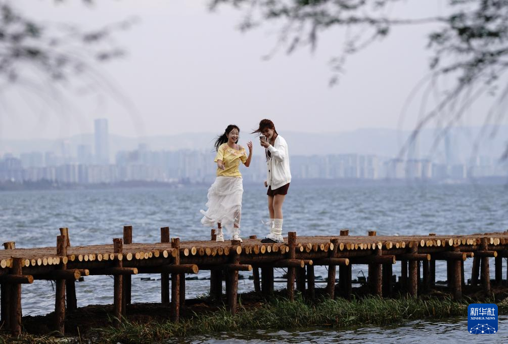 2月26日,两名游客在滇池边拍照打卡。新华社记者 陈欣波 摄