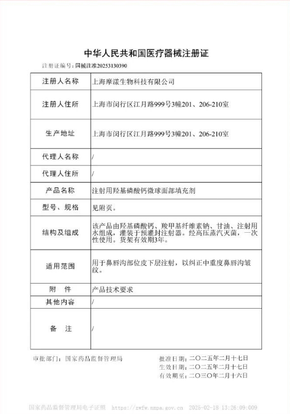(摩漾生物优法兰中国首张医美适应症羟基磷酸钙三类医疗器械注册证)