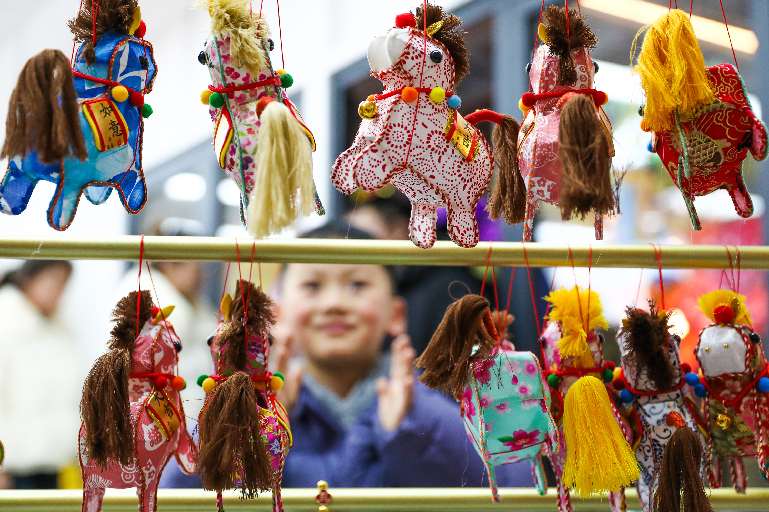 2026年2月19日,小朋友在江苏省海安市花海里花木市场文创基地挑选非遗彩灯。新华社发(顾彬斌摄)