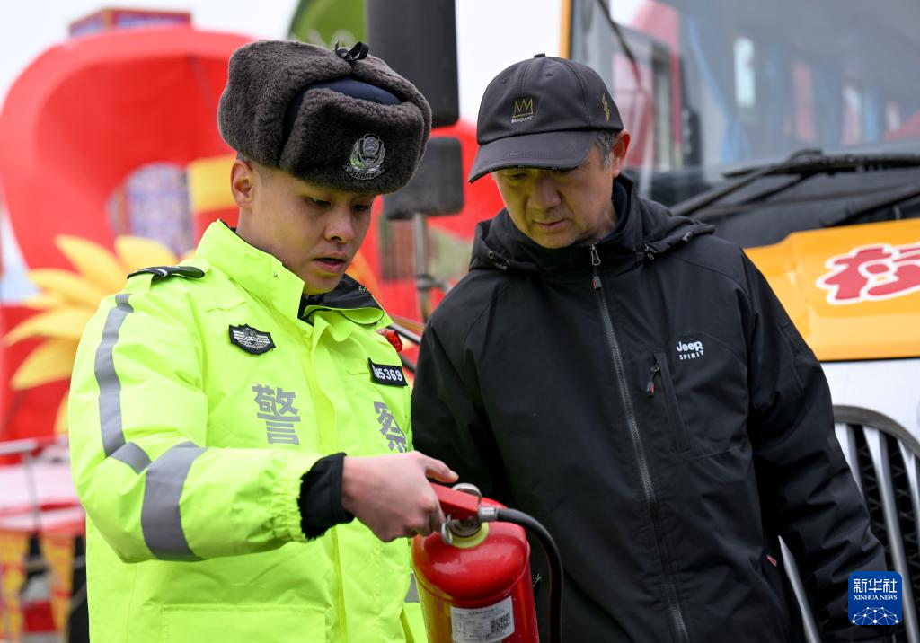 2月27日,新疆乌鲁木齐市公安局交通管理支队水磨沟区大队民警(左)在检查校车灭火器。新华社记者 王菲 摄