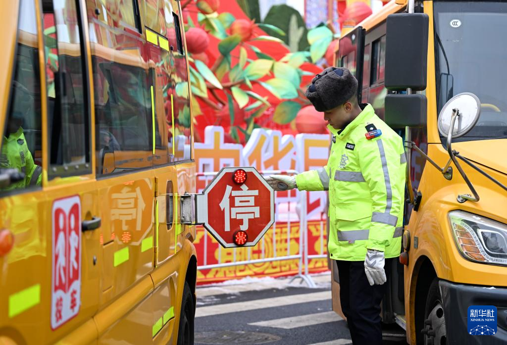 2月27日,新疆乌鲁木齐市公安局交通管理支队水磨沟区大队民警检查校车外观。