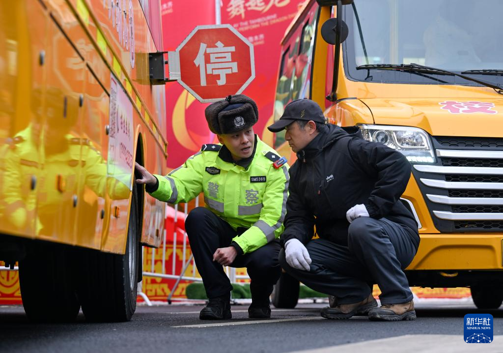 2月27日,新疆乌鲁木齐市公安局交通管理支队水磨沟区大队民警(左)在检查校车轮胎。新华社记者 王菲 摄