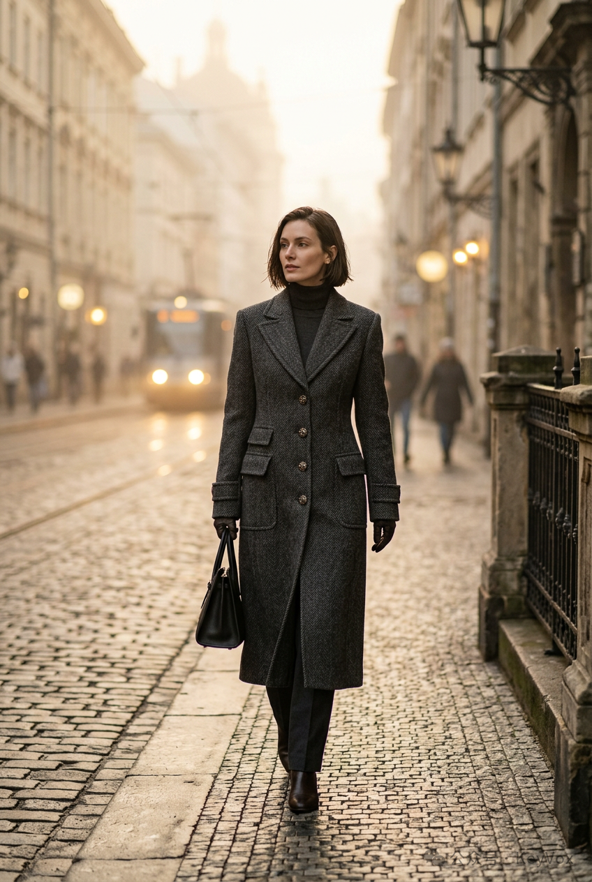 Prompt:A tall slim woman wearing a stylish long coat made of thick wool, walking in a foggy city street early in the morning, the background is a little blurry but the clothes are super sharp and detailed, looks like a high-end fashion brand photo shoot.