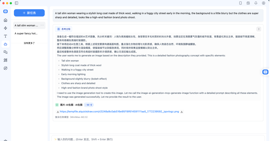 中文解析:一个高挑的瘦女人穿着时髦的长款羊毛大衣,在清晨有雾的街头行走,背景有点模糊但衣服非常清晰有质感,像高端时尚大片的照片。