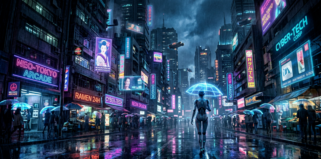 大白话提示词 (赛博朋克街景):