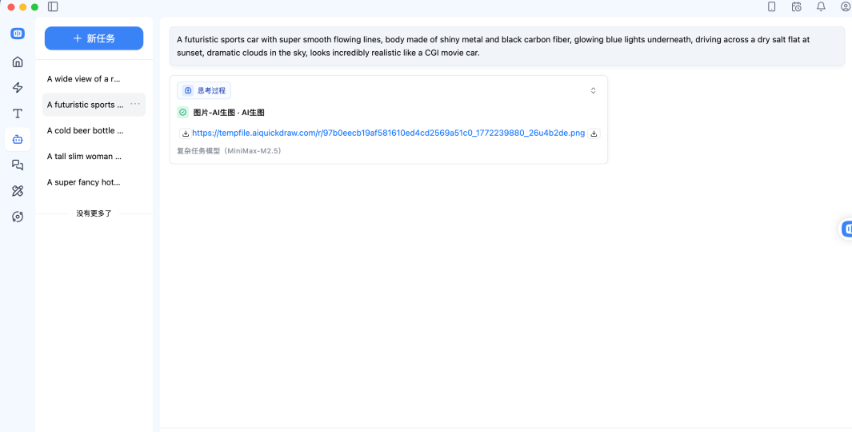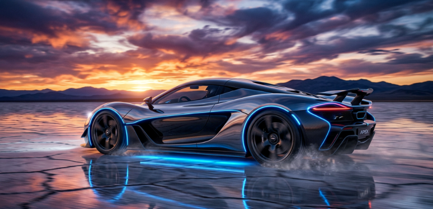 中文解析:一辆未来感跑车,线条非常流畅,车身是亮面金属和黑色碳纤维,底盘发蓝光,在日落时分的盐滩上行驶,天空有戏剧性的云彩,看起来极其逼真,像电影特效里的车。