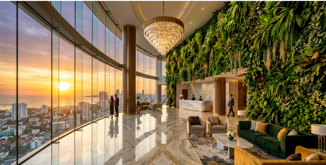 Prompt:A super fancy hotel lobby with huge curved glass windows, lots of green plants growing on the walls, the floor is shiny marble reflecting the sunset light from outside, very luxurious and modern, looks like a real photo taken with a wide-angle camera.