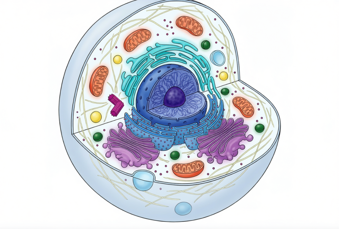 Prompt:A scientific diagram showing the inside of a human cell, cut open to see all the tiny parts, like the mitochondria and other organelles, each part colored differently and glowing a little, very detailed and clear on a white background, looks like a biology textbook illustration.