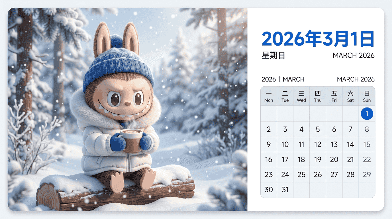 提示词:一种横向日历卡片设计,采用分屏构图。 左侧:LABUBU角色的详细3D渲染图,它穿着厚实蓬松的白色羽绒服和蓝色针织无檐小便帽。LABUBU坐在积雪覆盖的木头上,双手捧着一杯冒着热气的热可可,露出顽皮的笑容。背景是一个舒适、布满积雪的松树林,配有柔和的电影式灯光。具有3D艺术玩具质感。 右侧:一个简洁、极简的白色背景区域。顶部是大号、醒目的蓝色文字“2026年3月1日”。下方是整洁、现代的日历网格布局。 风格:UI设计美学,高质量渲染,卡片模型。16:9高清输出
