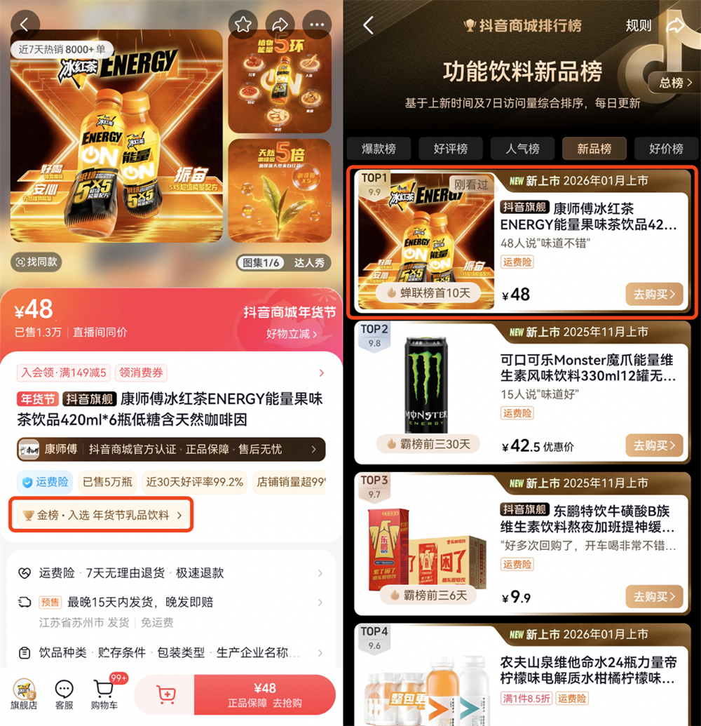 2026新年伊始,伴随着农历春节的年味越来越浓,各大品牌也迎来了抢水头、推新品的关键时刻。媒体注意到,康师傅这一次率先出击。1月29日,康师傅冰红茶Energy在抖音正式上线,一经上线就入选「年货节乳品饮料金榜」,并一举斩获抖音商城「功能饮料新品榜」TOP1,在整个饮品市场引发广泛关注和热议。