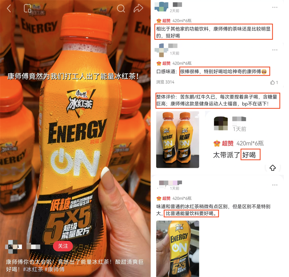 事实上,社交平台上关于康师傅冰红茶Energy的笔记已经不断涌现:有人表示新品让他“放弃了咖啡”“比其他能量饮料提神效果好,口感更好喝”,有人感慨“康师傅冰红茶Energy源自天然能量,提神更安心”……电商评论区也是好评如潮。随着康师傅冰红茶Energy的上市,其品牌势能和话题热度还在持续发酵,以“超赞”口碑触达更多圈层人群。