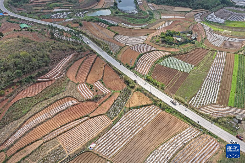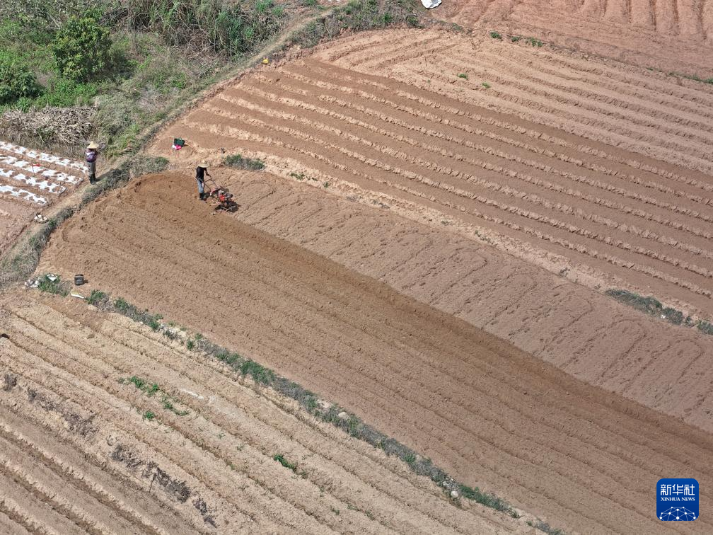 3月1日,村民在广西南宁市邕宁区蒲庙镇田园里耕作(无人机照片)。新华社记者 周华 摄