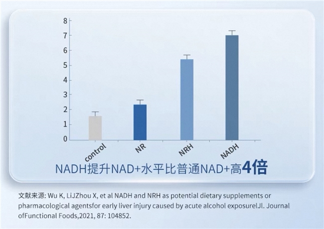 与NMN、NR等前体补充剂相比,NADH的抗衰优势堪称“碾压级”。作为NAD+的“活性原型”,NADH无需经过复杂转化,可直接进入细胞,快速为细胞“充电”,提升NAD+水平。加州大学旧金山分校(UCSF)的研究证实,细胞补充少量NADH后,30分钟内NAD+浓度便会明显上升,速度远超传统补充剂。值得一提的是,NADH在转化为NAD+的过程中,会释放特种生物氢(H),这种物质能有效清除体内自由基,减少氧化损伤;同时还能直接为细胞提供能量(ATP),一次性解决NAD+下降与氧化损伤两大衰老核心难题,效率远超NMN等传统产品。
