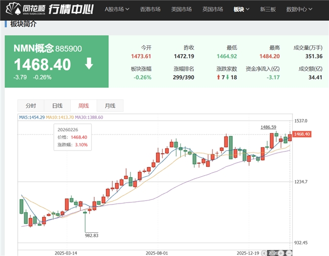 2026年全球NMN行业正经历一场“资本洗牌”。据同花顺金融数据库数据显示,截至2026年2月25日,NMN概念板块总市值达2439.91亿元,当日成交额58.45亿元,尽管板块行情有涨有跌、资本进出波动明显,但整体仍保持稳健发展态势。