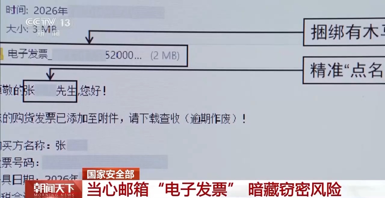 如今,各类电子发票通过邮箱传递越来越频繁,然而,一些看似正常的发票邮件,实则暗藏境外黑客组织窃密木马,一旦点击附件或链接,设备就可能沦为间谍窃密的突破口危害国家安全。国家安全机关近期侦破了此类案件,借此提醒公众高度警惕、严加防范。
