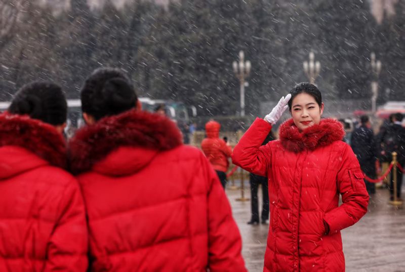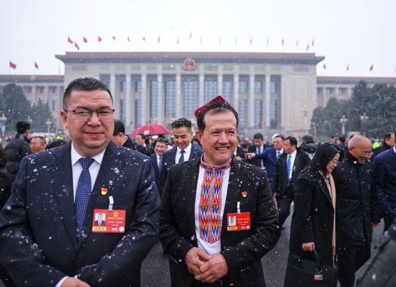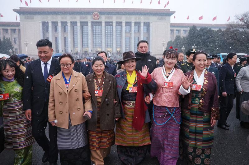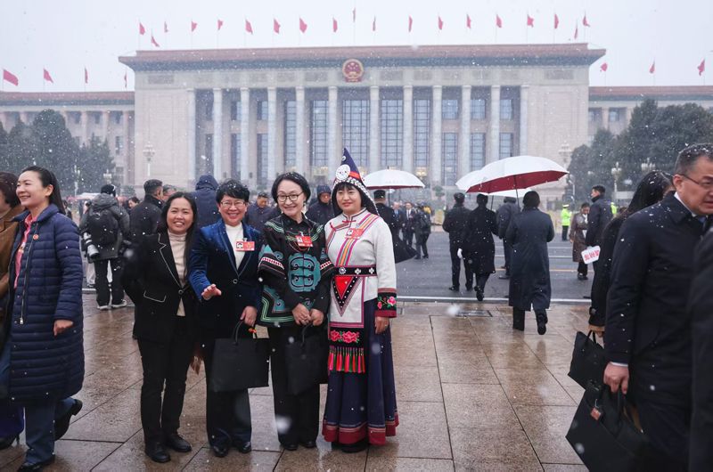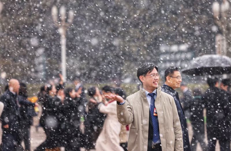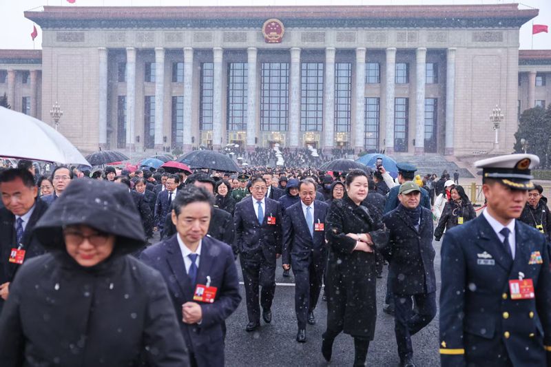 3月4日上午,瑞雪中,参加十四届全国人大四次会议预备会的人大代表走出人民大会堂。