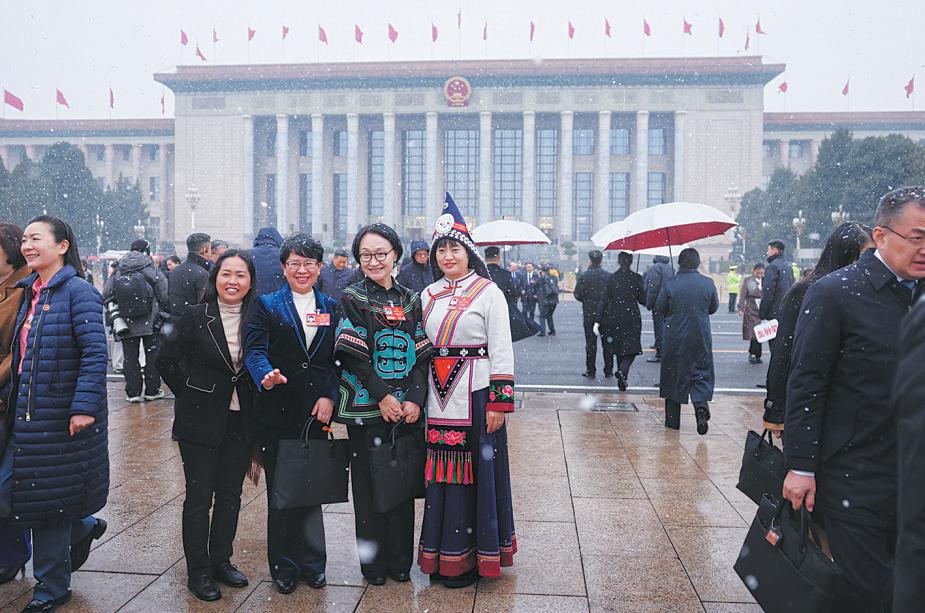 3月4日11时左右,刚刚参加完预备会议的人大代表陆续走出大会堂,此时雪下得正欢。北京3月很少见到这么大的雪,代表们也觉得惊喜,拉来身边的伙伴一同留下“雪中赴会”的珍贵画面。