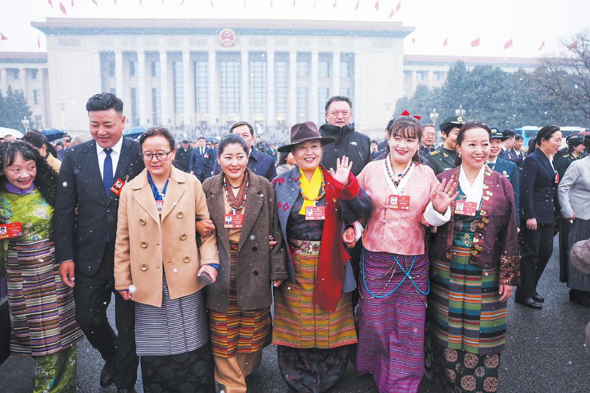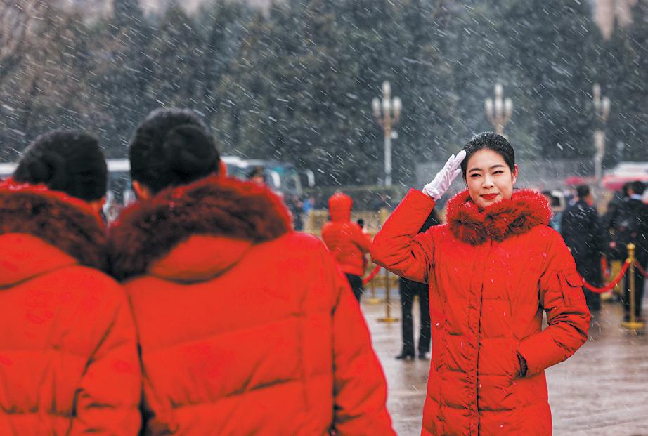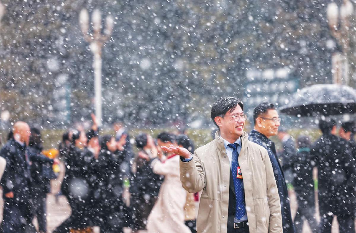 人大代表沉浸在雪中。