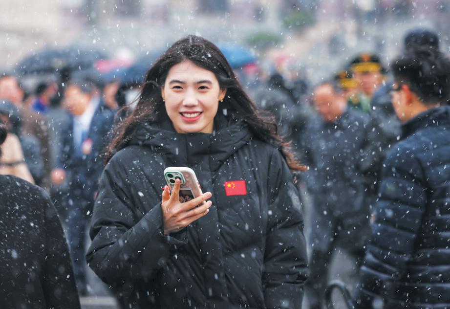 全国人大代表姚劲波在朋友圈晒出他与何小鹏代表、雷军代表的合影,并配文“瑞雪兆丰年,期待2026越来越好”。还有网友在社交媒体发布了自己与张雨霏代表的合影,“偶遇张雨霏,她说她也是第一次看到这样的天安门”,大雪中两个女孩子比出“胜利”手势,笑得灿烂。