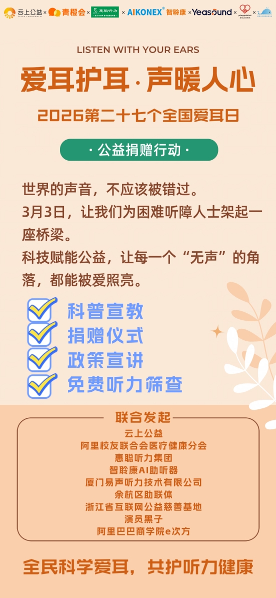 3月3日第27个全国爱耳日,一场以“全民科学爱耳,共护听力健康”为主题的大型公益活动在杭州市余杭区智慧公益慈善综合体温暖启幕。本次活动由云上公益、阿里校友联合会医疗健康分会、阿里巴巴商学院e次方、惠聪听力集团、智聆康AI助听器、厦门易声听力技术有限公司联合多家公益组织及医疗机构共同发起,通过“科普+筛查+捐赠+建档”一站式闭环服务,为困难听障人士送去科技温暖,打通听力健康服务的“最后一公里”。本次活动由爱心企业惠聪听力集团捐赠50台智聆康智能孝心助听器,由爱心企业厦门易声听力技术有限公司捐赠41台易声RIC700助听器,总价值60多万。由惠聪听力负责听力科普,听力检测,助听器验配和售后跟踪服务。