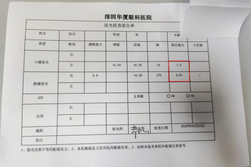 2026年2月24日,山东的张先生在深圳华厦眼科医院复查时,刚做完手术的右眼视力恢复到了0.8,左眼视力也稳定保持在1.0的高水平。这个结果,让他感慨万千。
