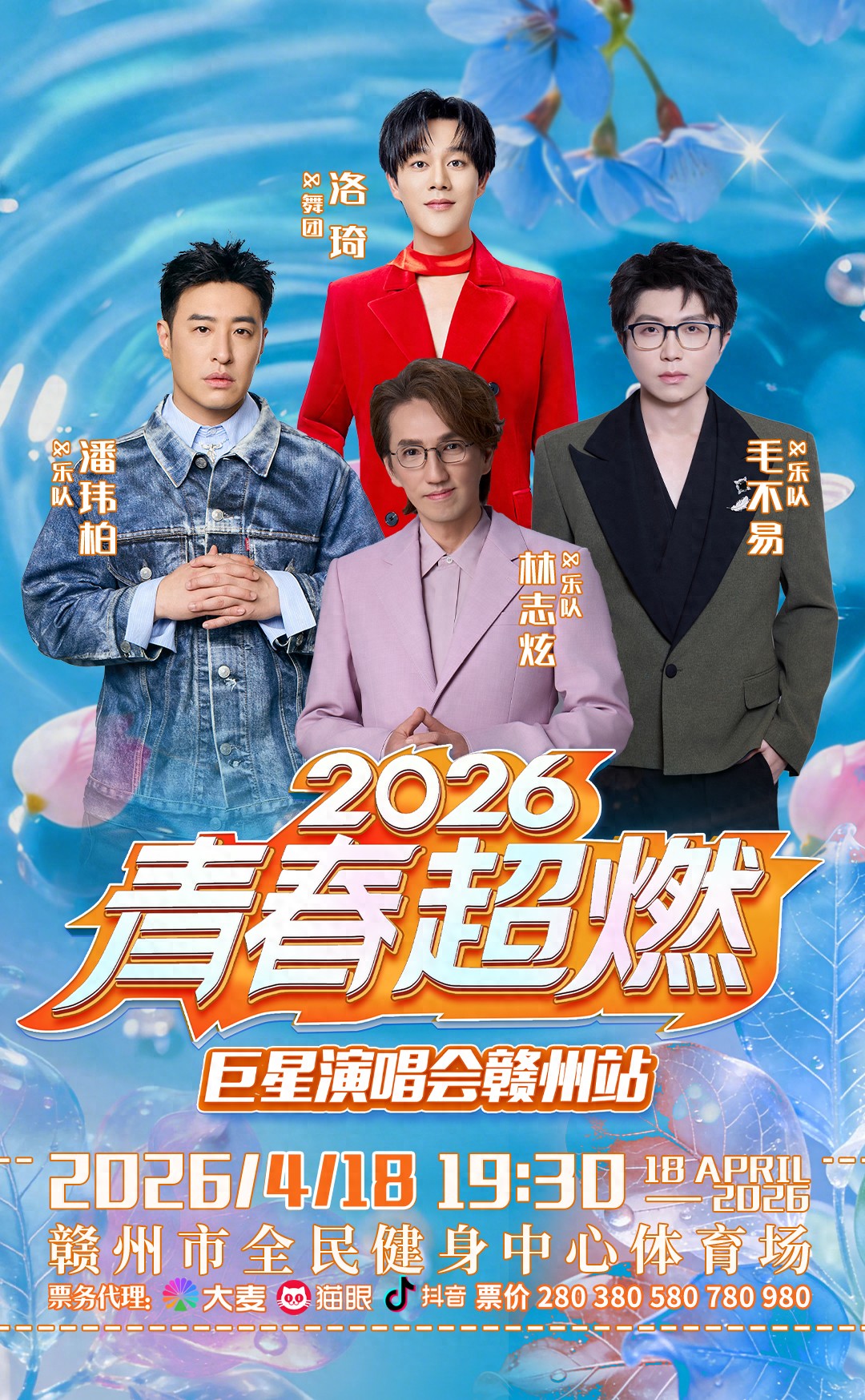 4月18日,赣州将迎来一场前所未有的音乐狂欢!2026青春超燃巨星演唱会(赣州站)将于当晚19:30在赣州市全民健身中心体育场火热开唱。毛不易、林志炫、潘玮柏、洛琦四位华语乐坛实力唱将强势集结,为赣州歌迷带来一场跨越青春的音乐盛宴。