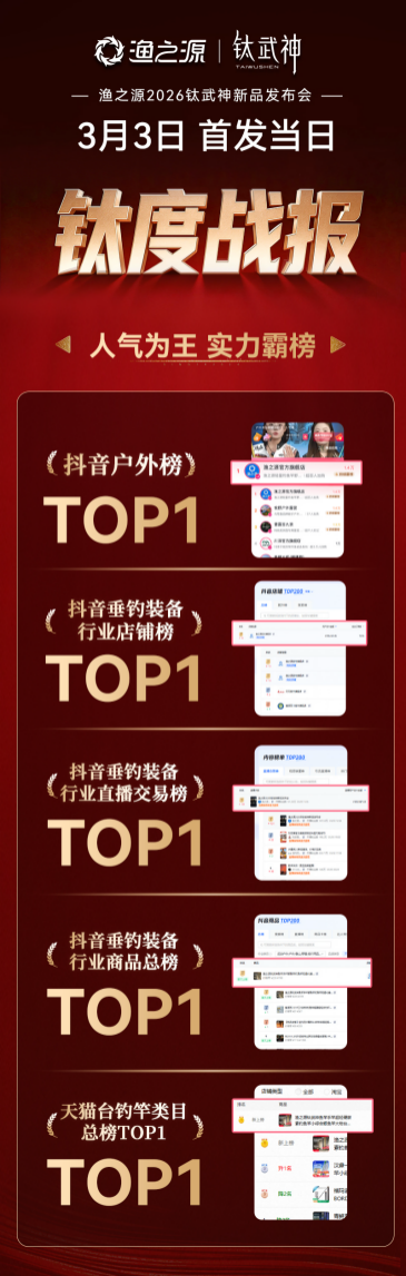 从渔之源公布的首发战报来看,钛武神在首发当日便引爆市场,斩获抖音户外榜、抖音垂钓装备行业店铺榜、直播交易榜、商品总榜及天猫台钓竿类目总榜五大核心榜单 TOP1,以压倒性优势刷新行业首发纪录,成为 2026 年开年渔具行业最具影响力的现象级新品。作为一款全新上市的产品,其热烈的市场反响和迅速攀升的销量,证明了钓友对“好产品”的辨别力与购买力,也印证了行业对这场“材料革命”的高度期待。