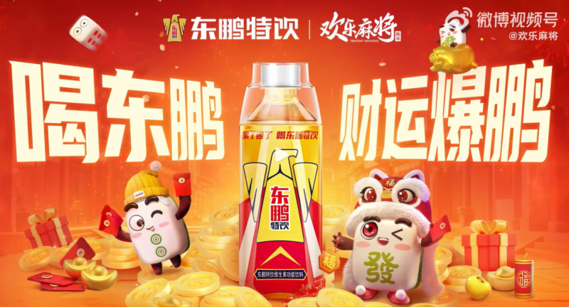 在游戏IP联动层面,东鹏特饮聚焦春节宅家娱乐的核心场景,与欢乐麻将、腾讯大掼蛋两大国民级棋牌游戏达成合作。游戏内上线东鹏定制牌桌、魔法表情及专属语音,将品牌元素融入游戏体验;同时发起“东鹏雀神争霸赛”,联动微博平台推出晒“好运签”、转发抽奖活动,奖品涵盖游戏豆礼包、联动周边及东鹏特饮整箱。通过#喝东鹏财运爆鹏##就这个东鹏特赢#等话题的持续发酵,东鹏特饮将“赢牌”与“赢运”深度绑定,贴合春节期间的社交娱乐需求,实现了品牌与用户的高频互动。