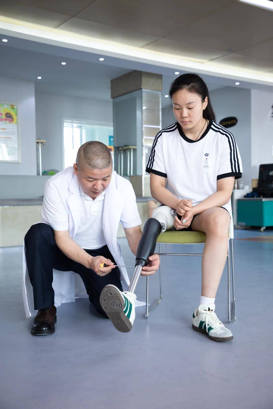 装配机构内,装配师正在为仿生腿用户调试仿生腿。图|受访者提供