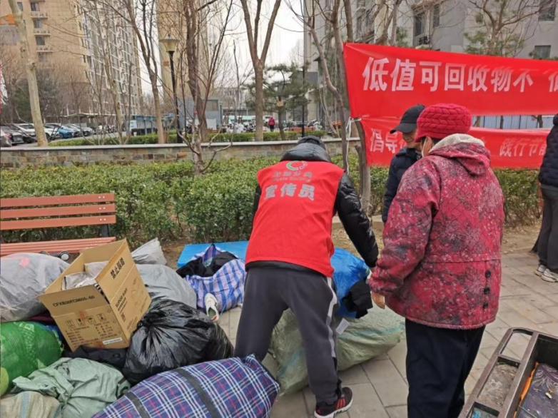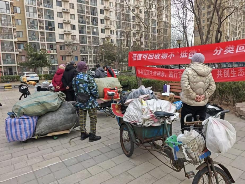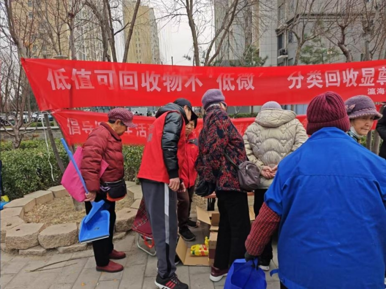 晨光中,社区工作人员与志愿者们早已忙碌:拉横幅、摆桌椅、调试称重工具,每一个动作都带着朴素的仪式感。横幅上“低值可回收物不‘低微’,分类回收显尊贵”的字样,在风中微晃,却稳稳落在每个人心里。
