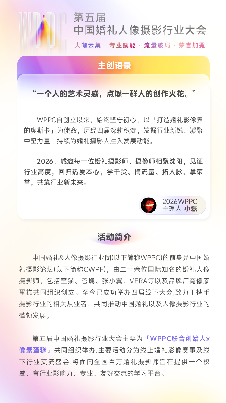 2026年3月6日,WPPC2026(第五届中国婚礼人像摄影行业大会)VIP门票正式开售,几分钟内首批席位全部售罄。本次大会由AI修图软件像素蛋糕与WPPC联合主办,将于6月2日-6月4日在沈阳举办。