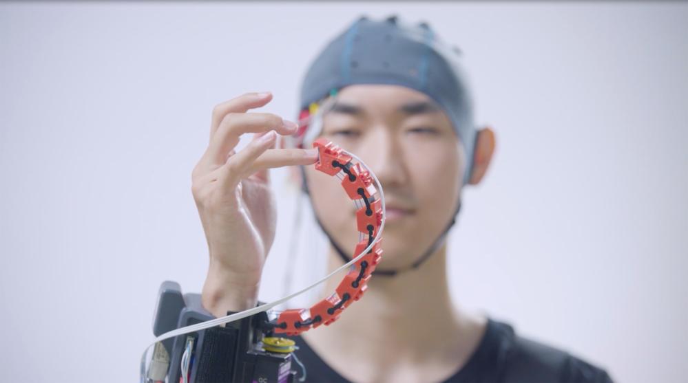 天津大学科研人员测试脑控外肢体(手部)康复机器人。新华社发