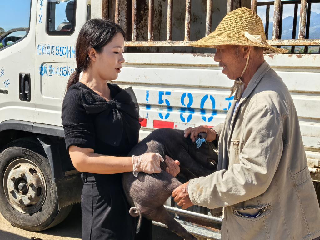 李志娟给当地村民发放黑猪种猪。(受访者供图)