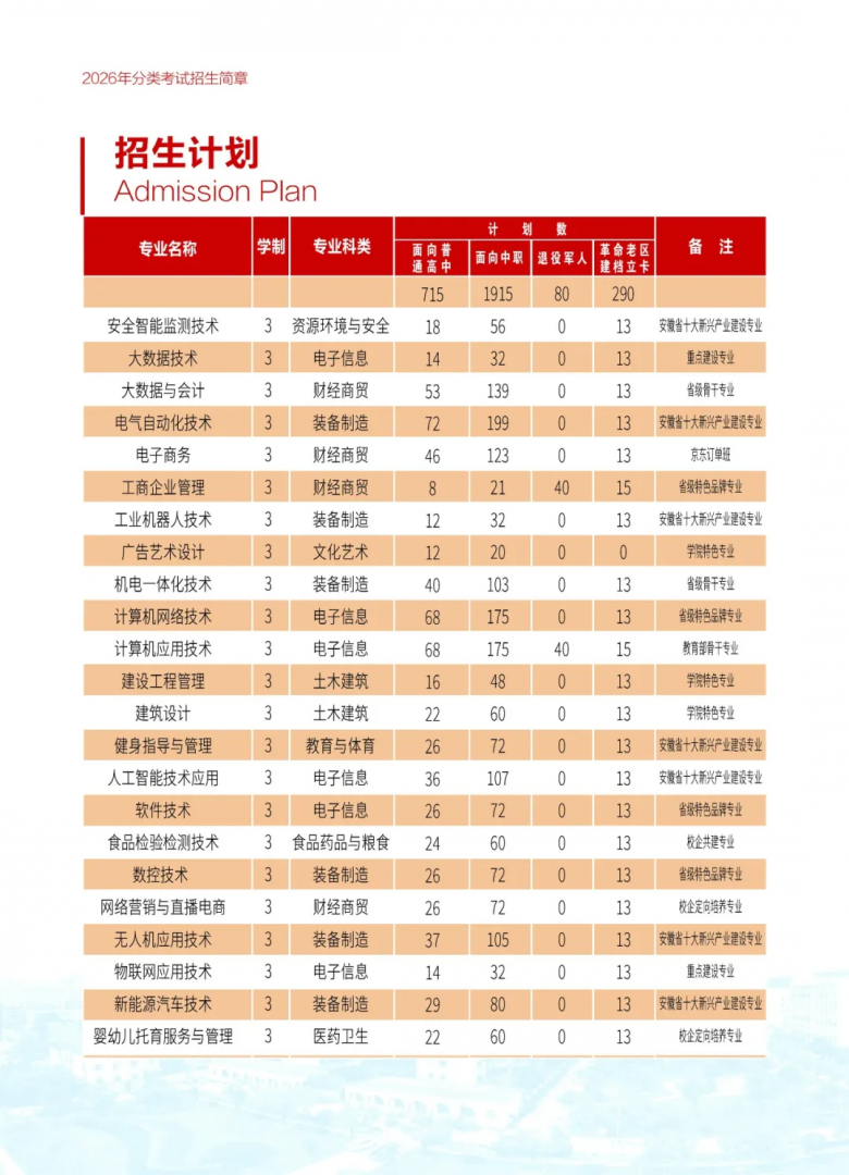 作为经安徽省人民政府批准、国家教育部备案的省属全日制公办普通高等职业院校,安徽工贸职业技术学院深耕职业教育三十余载,此次分类考试招生计划覆盖装备制造、电子与信息、财经商贸、土木建筑、食品药品与粮食、教育与体育、艺术设计等专业大类,涵盖普高、中职、退役军人、革命老区建档立卡等多个报考群体,充分满足不同考生的升学需求。