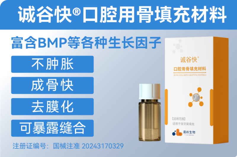 作为易岭生物的拳头产品,诚谷快®系列含口腔用骨填充材料(韧性胶原骨)与口腔可吸收修复膜(韧性胶原膜)两大品类,均拥有自主发明专利,攻克了再生材料完全降解、生物活性与术中操作三大行业难题,更构建起“胶原支架-血管生成-炎症调控”三位一体骨再生模型,精准破解口腔组织修复核心痛点。韧性胶原骨富含BMP、VEGF等生长因子,成骨快、可暴露缝合,块状结构能缩短80%手术时间,适配拔牙窝填充、上颌窦提升等场景,还可在感染环境中使用,术后反应轻,可生成自体骨;韧性胶原膜无交联剂工艺简化操作,多层结构提供3个月屏障作用,完全降解无需二次手术,大幅降低基层医生使用门槛与患者治疗成本。