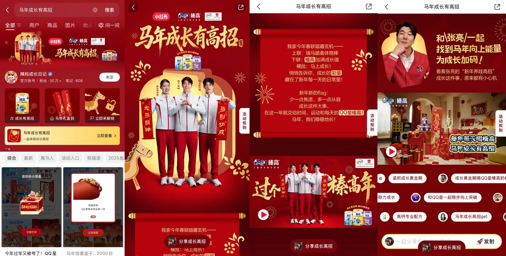 为打造沉浸式、立体化的新春营销体验,小红书与伊利QQ星榛高奶粉展开多维联动,布局全链路内容生态,从明星亲子引领到KOL多元种草,层层递进、多维发力,实现了流量聚合与价值传递的双重效果,让#马年成长有高招话题成为小红书站内新春母婴营销的热门亮点。
