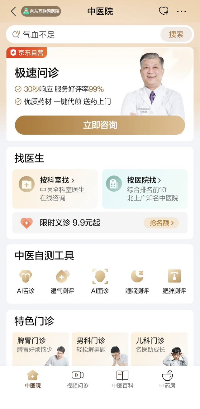 用户打开京东App,搜索“中医院”即可进入在线问诊平台,享受24小时医生在线、平均30秒接诊服务;搜索“中药房”可在线抓取优质中药,药品质量有保障。平台还设有中医特色专病门诊,针对失眠、消化不良、月经不调等常见问题提供专病专治方案。