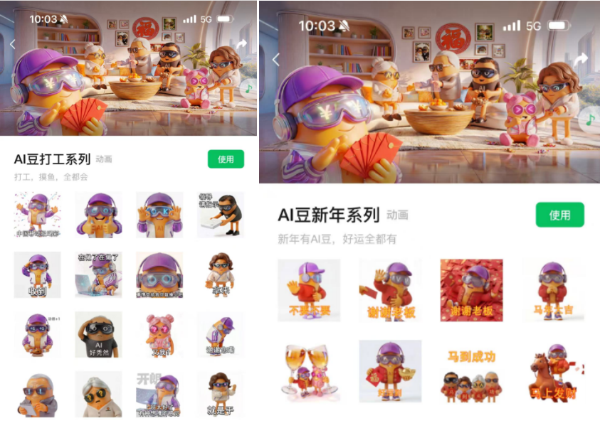 "厨师鸡"的趣味片段让"笑死我了""笑出猪叫"等评论刷屏,成为大家的解压素材;AI豆的新春表情包和打工人共情表情包,悄然成为职场沟通、日常聊天的"万能工具"——"干杯""又我?""好秃然"等表情,精准击中了每个打工人的日常。