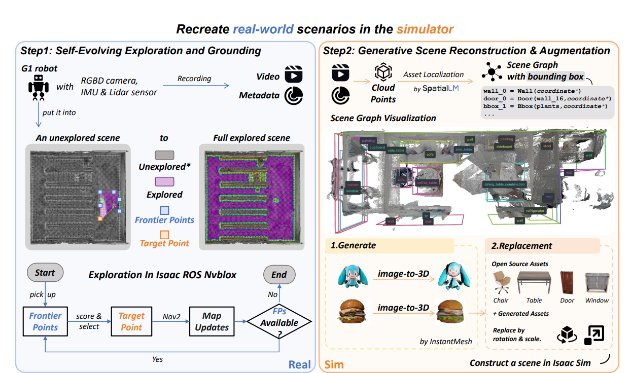 在该框架中,群核科技发挥了其在空间重建和空间生成上的核心优势。依托其自研的SpatialLM大模型,系统能够将机器人采集的多模态传感器数据高效解析为结构化语义信息;结合SpatialGen的空间生成能力,系统可自动生成丰富的仿真3D场景。随后,通过空间智能训练平台SpatialVerse进行物理特性模拟和和数据扩增,为机器人提供了海量且物理一致的“训练场”。