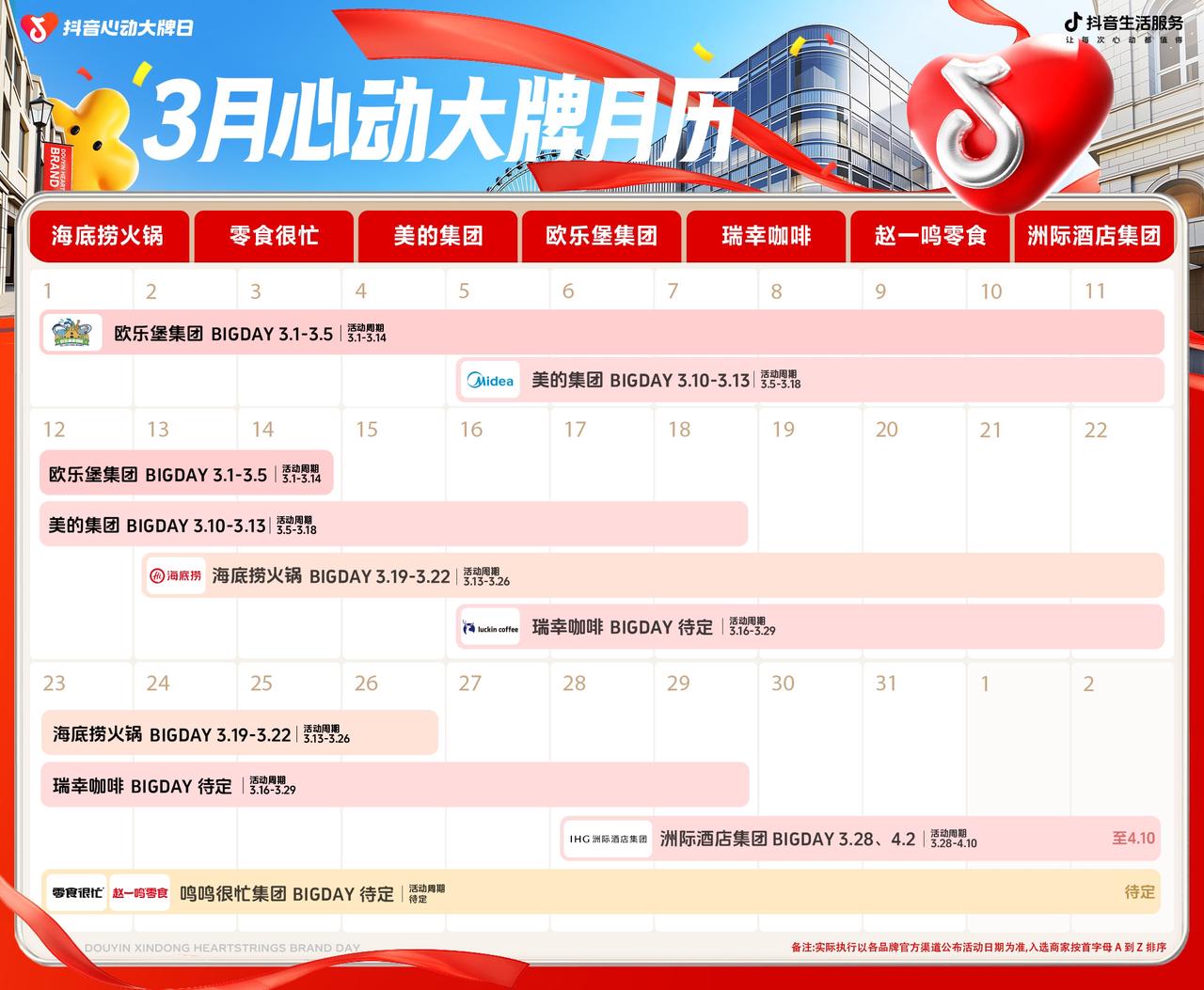 春风送暖,消费市场也随之升温。38节的仪式感、踏青出游的向往、家居焕新的念头,共同构成了三月蓬勃的消费活力。这个三月,「抖音心动大牌日」汇聚海底捞、美的集团、洲际酒店集团、鸣鸣很忙集团(零食很忙、赵一鸣零食)、瑞幸、欧乐堡等诸多优质大牌,与春日消费热潮深度融合,全方位激活春季消费潜能,助力每一次品牌发声,都精准落入用户的心动区间。