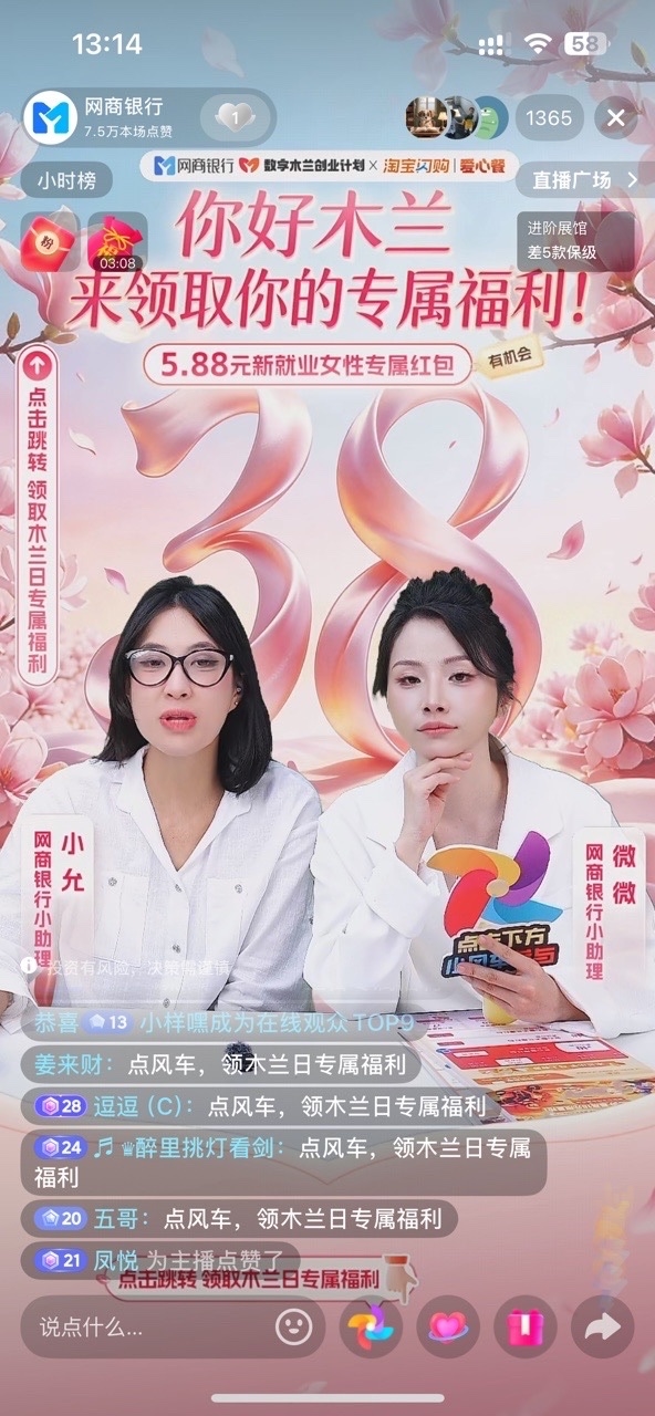 3月8日上午11点,网商银行官方直播间准时上线“3.8木兰专场”。不同于传统节日慰问,本次直播以“数字木兰创业计划”为基石,面向新就业女性群体送出节日礼物。参与活动的女性骑手、快递员、网约车司机等新就业形态劳动者可领取最高18元的淘宝闪购爱心餐木兰红包。