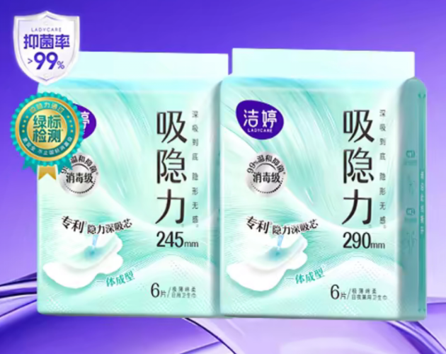 洁婷的吸隐力系列采用空气编织一体成型工艺,整体厚度仅0.1cm,实现“隐形无感”佩戴体验;3秒快速吸收并牢牢锁住经血,有效减少外漏风险;柔性腰翼设计高度贴合身形,活动自如不移位;具备99%抑菌能力,并通过绿标消毒级标准认证,确保全程洁净卫生。