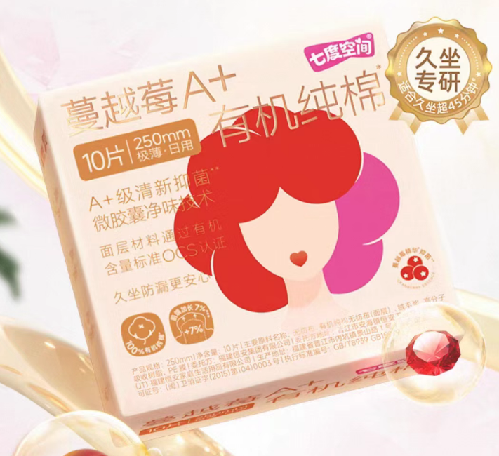 七度空间专为年轻女性设计,其蔓越莓抑菌纯棉系列采用100%纯棉亲肤面层,柔软细腻,减少摩擦不适;抑菌表层添加天然蔓越莓提取物,从源头抑制细菌滋生;瞬吸芯体配合高透气底膜,快速导流经血,缓解闷热黏腻;提供日用、夜用、超长夜用多种规格,灵活适配不同场景。