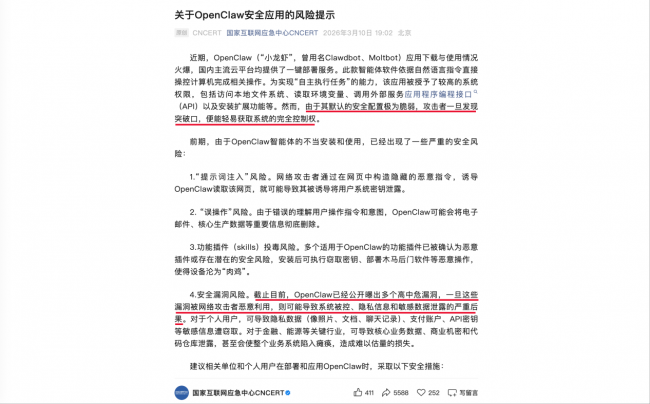 3月10日,“国家互联网应急中心CNCERT”发布《关于OpenClaw安全应用的风险提示》指出:目前,OpenClaw已经公开曝出多个高中危漏洞,一旦这些漏洞被网络攻击者恶意利用,则可能导致系统被控、隐私信息和敏感数据泄露的严重后果。