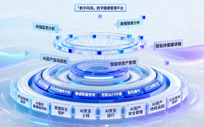 当“看不见”的资产成为攻击入口,“管不住”的权限成为执行工具,“防不住”的渗透成为扩散路径,企业传统的网络边界防护体系便面临失效。面对这种结构性风险,企业需要的不是简单的封堵或禁令,而是一套能够贯穿AI Agent全生命周期的数字健康管理方案——从发现隐匿资产、约束执行权限,到持续监测行为、阻断恶意利用,实现从被动应对到主动治理的转变。