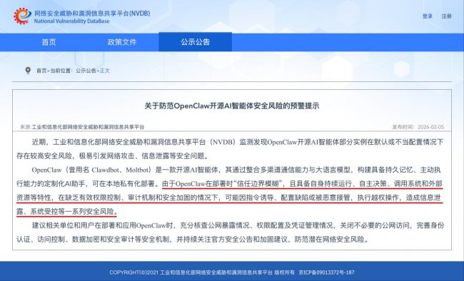 2026年2月,工业和信息化部网络安全威胁和漏洞信息共享平台发布了关于OpenClaw的紧急安全预警,明确指出该工具在默认或不当配置情况下存在较高安全风险,极易引发网络攻击、信息泄露、系统受控等严重安全问题。
