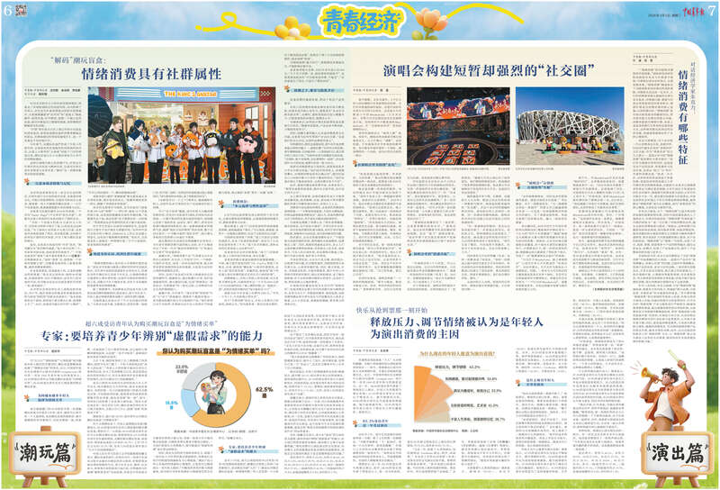 消费端彰显“青春经济”活力。青年消费者追求的不再是单一产品,而是更加注重情感共鸣、文化认同和价值表达,由“性价比”转向“心价比”。中青报及中青校媒记者调研发现,61.2%的受访青年会为了释放压力、调节情绪而为演出花钱,62.5%的受访青年认为购买潮玩盲盒是在为情绪买单。国研新经济研究院创始院长朱克力认为,年轻一代的消费正变得越来越多元化、个性化,充满文化感、设计感和科技感。“这些特性与社会跃迁密切相关。”