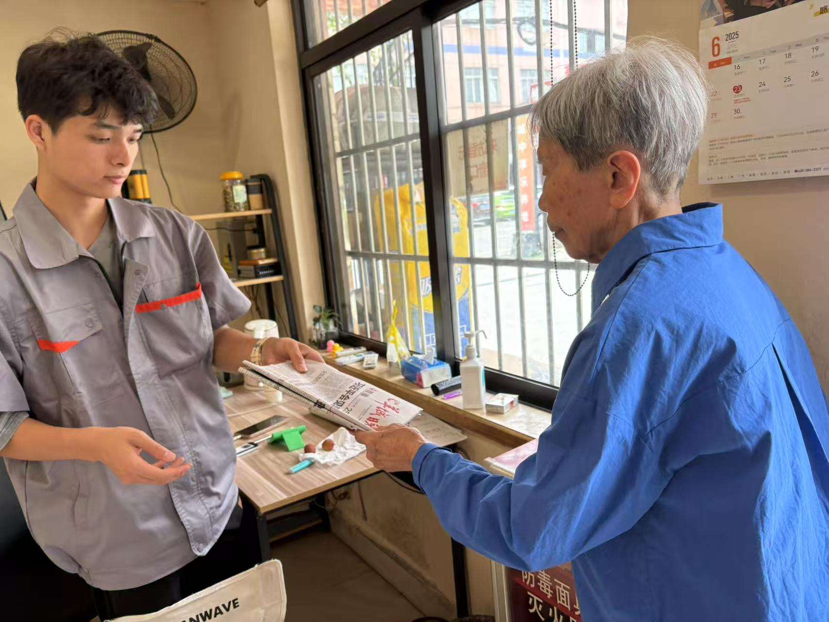 在这份默契的“合同”里,每天早晨去门卫室取报纸是“外出采访”,看报是“资料收集”,在纸上写写划划是“撰稿”。门卫室从此有了新身份——刘老师的“编辑部”;肖宁君也有了新身份——她的“同事”。