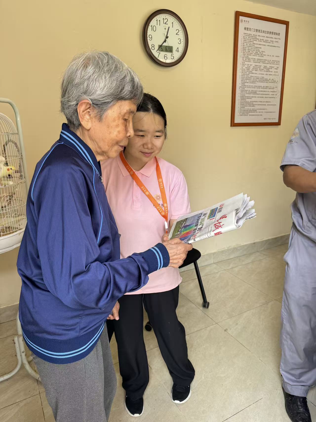 如今,刘老师和肖宁君的“编辑部”已经成为椿萱茂(广州兴业)老年公寓的一道温馨风景。在这里,一位91岁双耳失聪的认知症长辈,与一位24岁的生活助理,用纸笔延续着新闻的对话,用心灵沟通跨越了年龄、疾病和感官的限制。